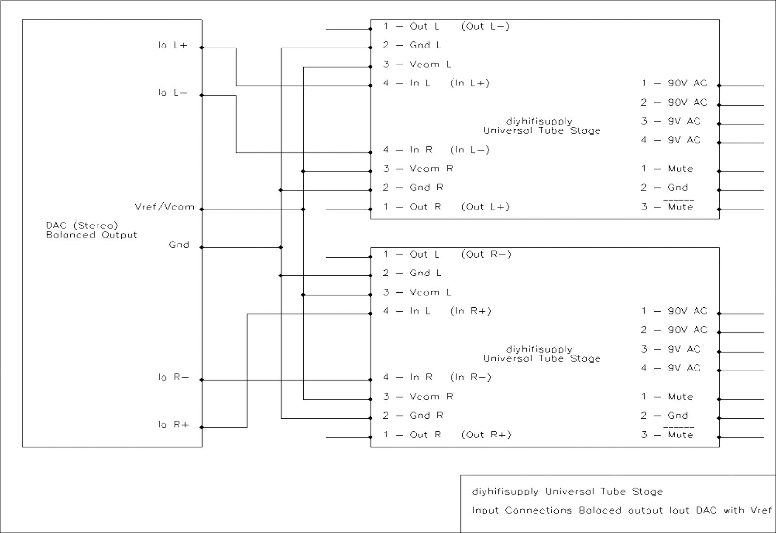All Ground connections must be made to the DAC’s Analogue Ground Pin. All Vcom connections from the Universal Tube Output Stage must be made to the “Reference Voltage (Vref)” or “Common Mode Voltage (Vcom)” Pin(s) on the DAC.