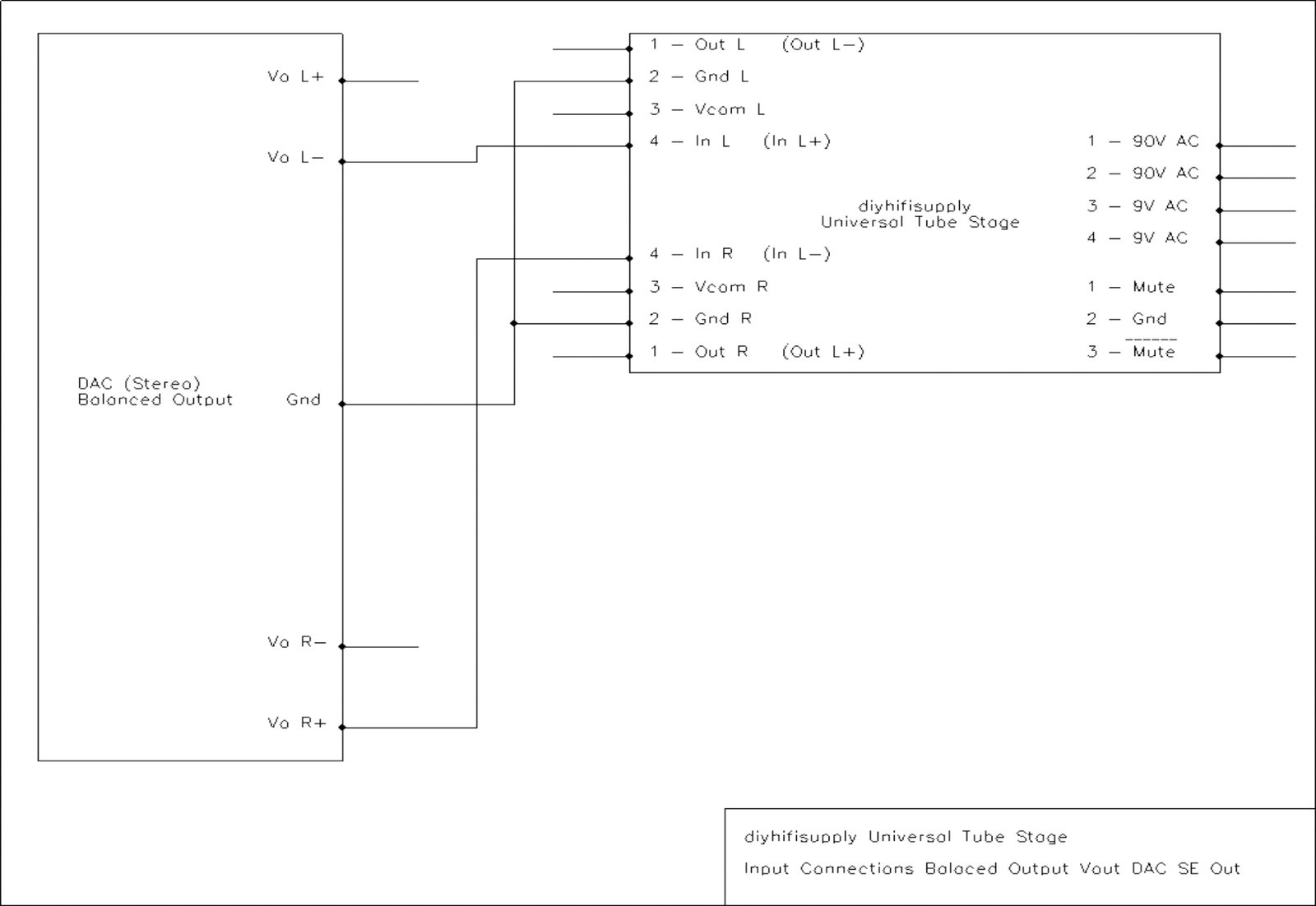 3.14 – Settings and Input wiring for single ended stereo output from voltage output DAC, stereo, balanced output, 2..3 VRMS full scale output voltage, 2.5V reference voltage