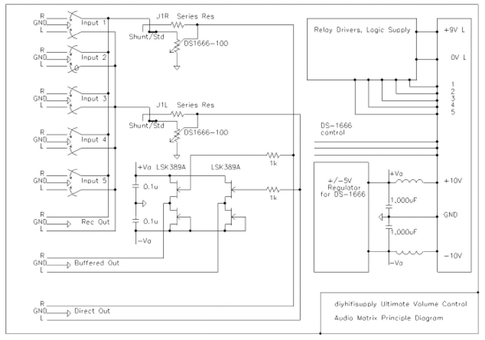 Each Audio Matrix PCB has five 2-Channel line level inputs selected via high grade hermetically sealed gold over silver contact relays, and five two channel attenuators using the DS-1666 DCAP and optionally a 2 Channel J- Fet Buffer (2pcs LSK389A available separately). It also contains the local power supply with LC filtering for the buffer and further regulation for the DS-1666 DCAP.